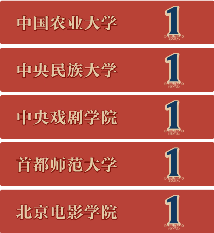 毕业生以卓越成绩,圆梦多所名校,收获中央民族大学、中国农业大学、中央戏剧学院、北京电影学院、中国民航大学、首都师范大学等院校录取。