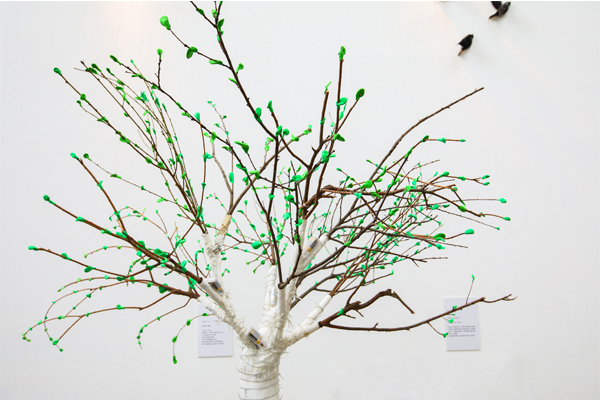 树,是上天赐给人类的一样宝物,可以为人类安家、立业,清洁空气,帮助人类进步。蓝色,是天和海的颜色,是新英才的底色。蓝色也是环保色,我们渴望北京的蓝天,我们渴望蓝色。该作品采用的木材和纸都来自于有生命的绿树。如今这棵树被我们赋予了新的生命意义——对蓝色的渴望、对环保的思考,我们能做出有生命的树吗?
