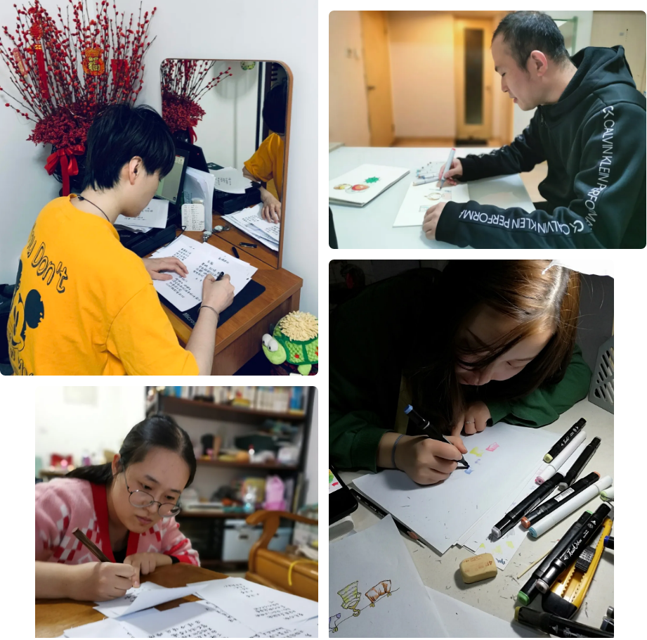 从画面铅笔稿的勾勒,到每句文字对应的画面构图再到人物表情的精心绘制、全图上色,老师们用手中的画笔传递着热情。从人物到背景,从全图到细节,老师们脑海中一次次闪现出孩子们的如花笑靥。书法老师们仔细研究与漫画风格所匹配的字体,运转笔锋,文字写满了几十页纸。