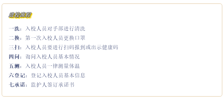 在班主任引领下,在校门口完成“一洗、二换、三扫、四问、五测、六登记、七承诺”的流程进校。家长送完学生即走,不下车,不进校,避免交叉感染