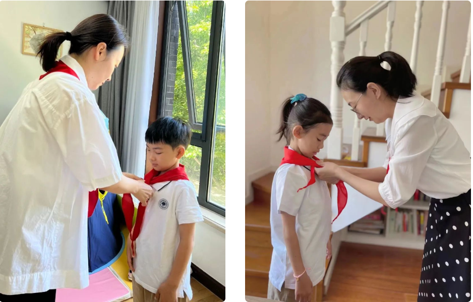今天陪伴小朋友们经历了一次不一样的少先队入队仪式。看队旗升起,隔着屏幕,感受到了同学们心情的激情澎湃。由家人为孩子们佩戴红领巾,为孩子们整理衣领。小小的红领巾不仅链接着小朋友与少先队,也成为了家人之间的纽带。小朋友们几乎全程站姿端正,相信通过这一次特殊的入队,能够培养孩子们的家国情怀,成为日后激励孩子们学习生活的动力之一。