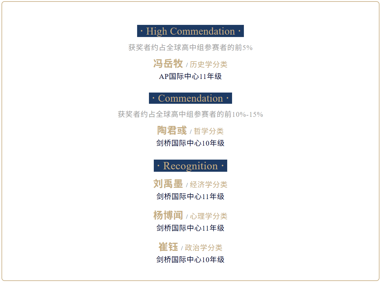 而今,获奖学科领域进一步拓展,更在奖项级别上实现新的飞跃——High Commendation的获得,标志着学校的学术培养水平迈上了新的台阶。