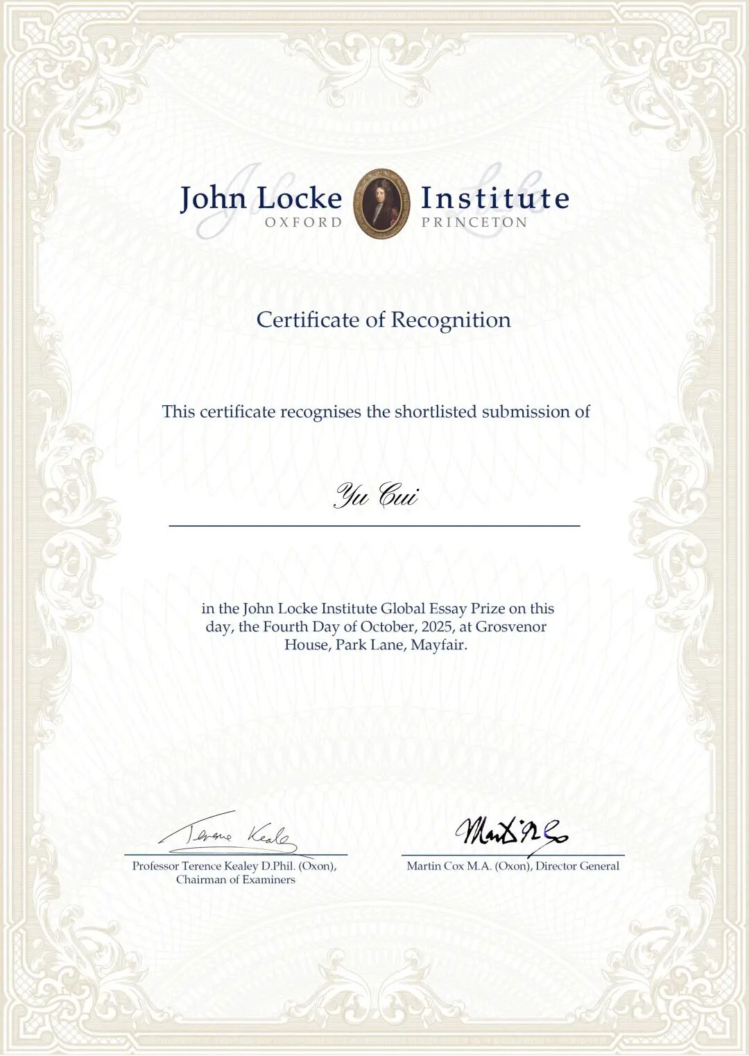 回顾这段探索历程,崔钰认为最大的收获并非竞赛成绩,而是学术自信的建立。“从EPQ到John Locke竞赛,我学会了如何将零散的想法系统化,如何在不同文化间建立对话,更坚定了我想要学习人文社科的研究道路。”