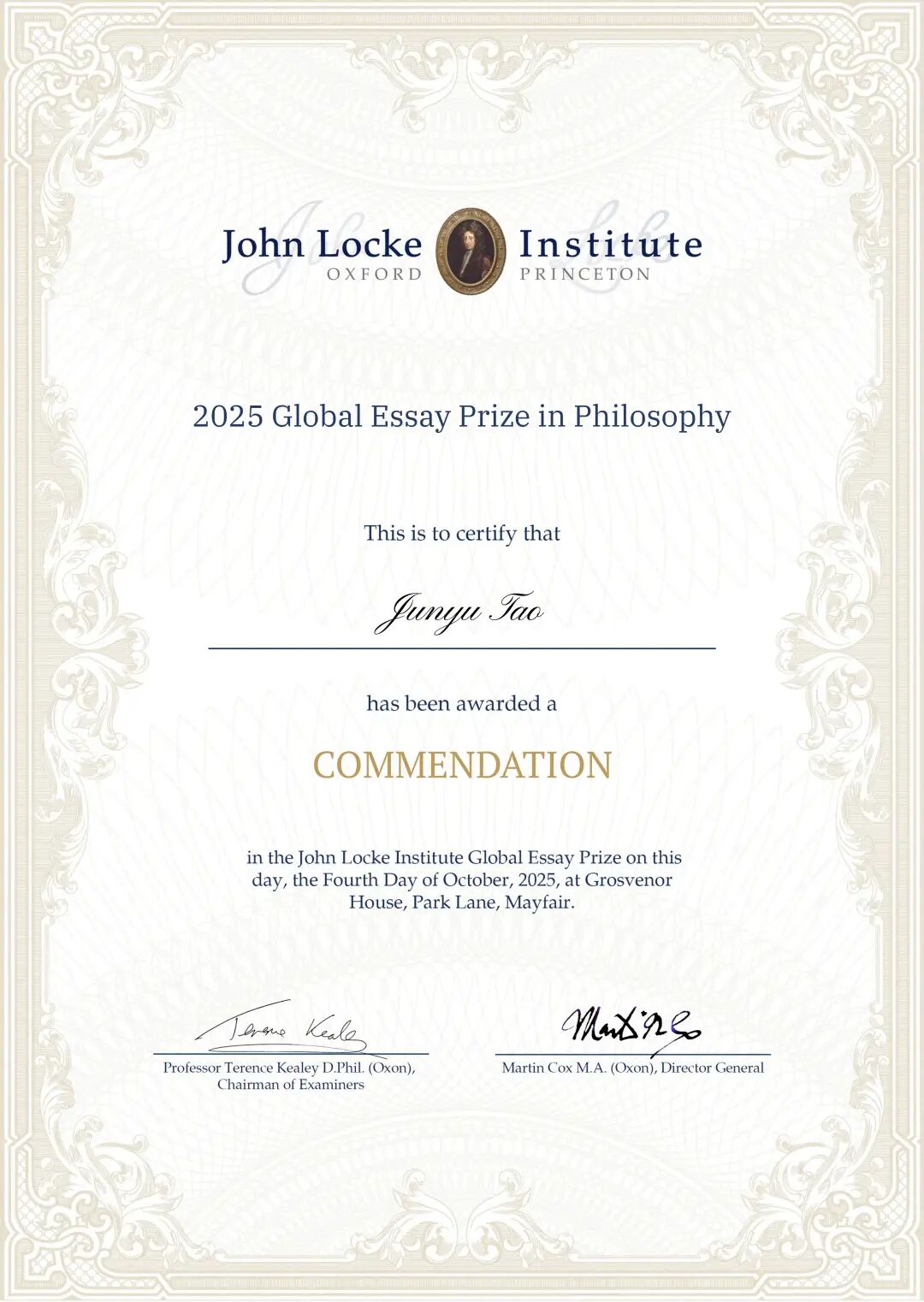 当剑桥国际中心10年级的陶君彧选择挑战John Locke哲学竞赛的命题——“When civilians are the main target, there's no need to consider the cause. That's terrorism; it's evil." Is this correct?这位未来计划攻读化学或建筑专业的理科生,开启了一场意料之外却又情理之中的思想探险。最终获得的COMMENDATION奖项,对他而言最重要的不是荣誉本身,而是思维认知的深刻刷新。*“当平民成为主要目标时,就无需考虑原因。这就是恐怖主义,这就是邪恶。”这是对的吗?