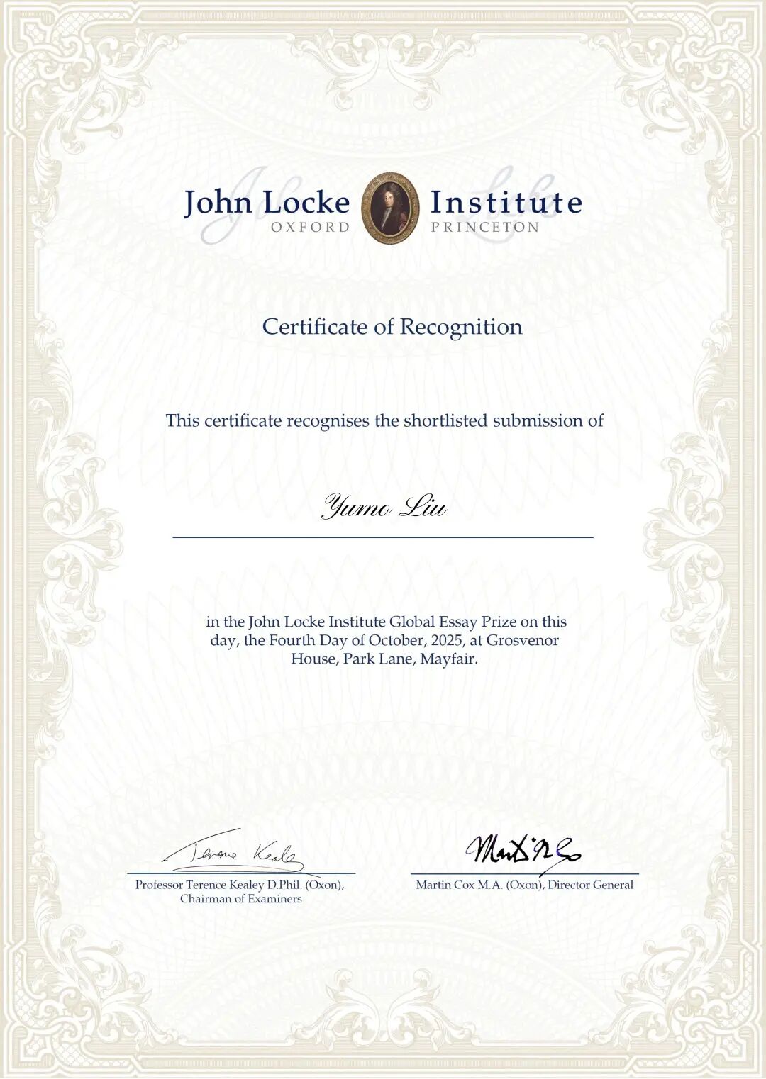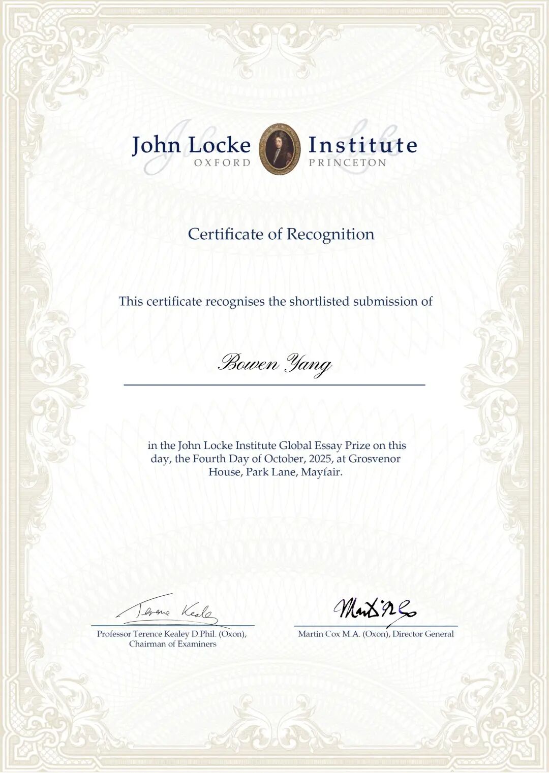在世界顶尖的中学生学术竞赛版图上,John Locke Essay Competition(约翰·洛克论文竞赛)以其跨学科的广度、思想的深度与学术的严苛要求,被公认为人文社科领域的“天花板”。每年,全球成千上万的优秀学子投身这场思想的盛宴,而最终能够成功入围的,始终只是凤毛麟角——今年的全球入围率,仅为18.65%。