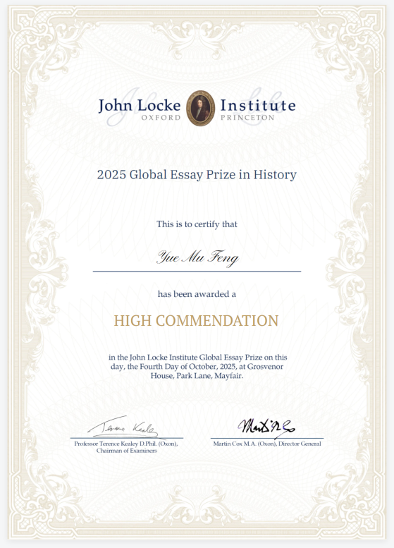 来自AP国际中心11年级的冯岳牧凭借其深刻的历史思辨,在今年的John Locke竞赛中荣获HIGH COMMENDATION奖项。这份荣誉的背后,是他在浩瀚史料中精准筛选信息的眼光,以及构建严谨论证框架的学术能力——这些正是他在新英才学校的教育中培育出的重要素养。