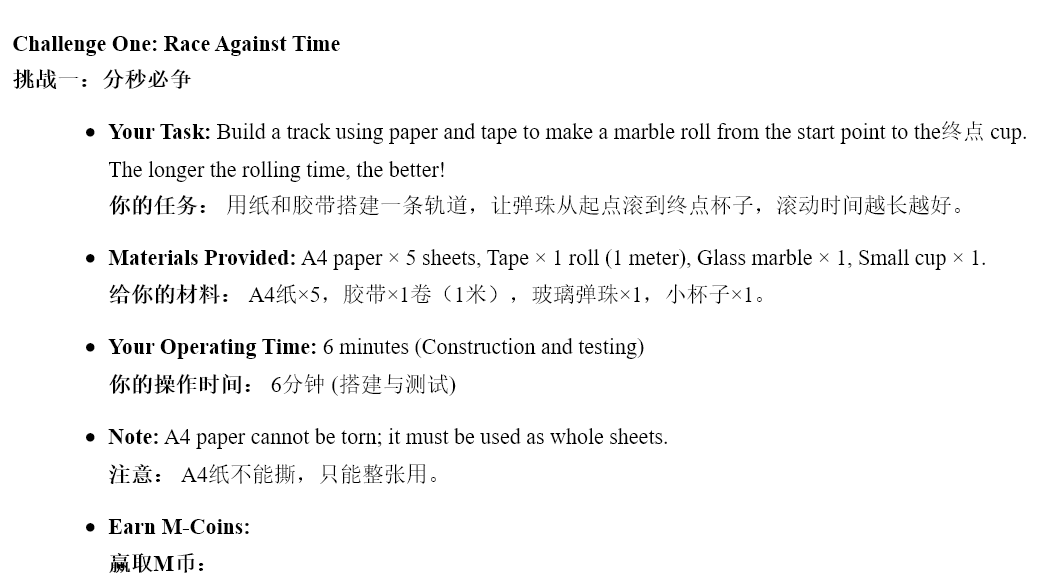 “分秒必争”环节,目标是在有限材料下搭建一条弹珠轨道,使弹珠滚动时间尽可能长。多数参赛者普遍选择迅速动手堆叠结构,来自AP国际中心的何柚熹先观察材料,在脑海中构思一条打破常规的路线。这种冷静分析与逆向思维,体现了科学探究的另一种可能性。