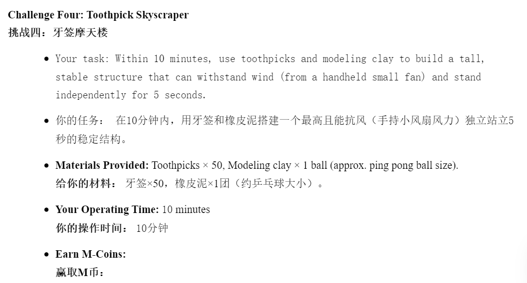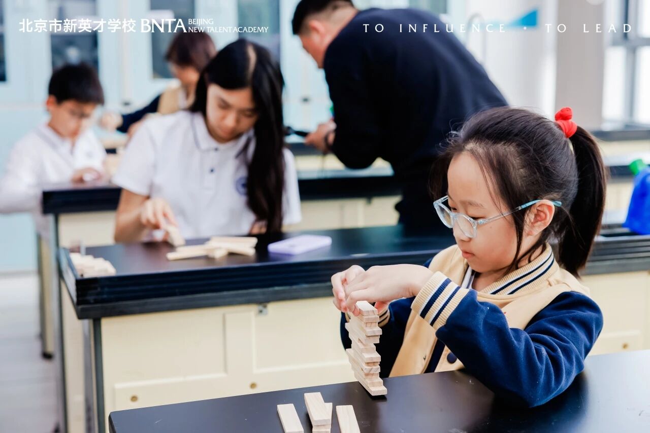“牙签摩天楼”环节,学生用牙签和橡皮泥搭建塔楼,不仅要追求高度,还要经受手持风扇的考验。初中部乔子曦凭借稳定的三角形架构,获得了全场最高成绩。