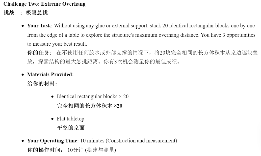 “极限悬挑”环节,不用胶水,仅凭20块积木,搭建出最大的悬挑距离。AP国际中心段宇凡精确找到搭建的平衡点,展现了对力学的深刻理解。