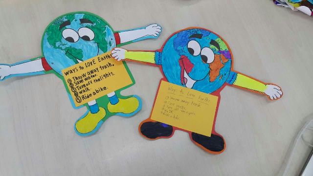 For Earth Day, our students learn a lot about keeping our environment clean through pictures, through asking questions, and through making a project. After expressing their wish for a clean Earth, the students worked together in teams to color, cut, and assemble a happy Earth cutout as a reminder of what practices we can undergo to obtain a cleaner Earth.