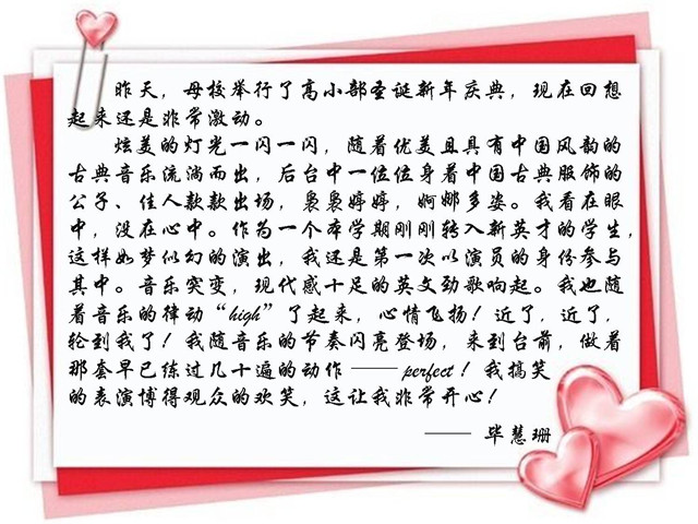 2015年12月27号,下午两点半,高小部举办的“爱在嘉年华”圣诞元旦联欢活动开始了。前来参与活动的各界来宾络绎不绝地走进学校,在迎宾员的引领下先在小学部大厅陆续参加游园系列活动,然后一起走进一楼篮球馆主会场……